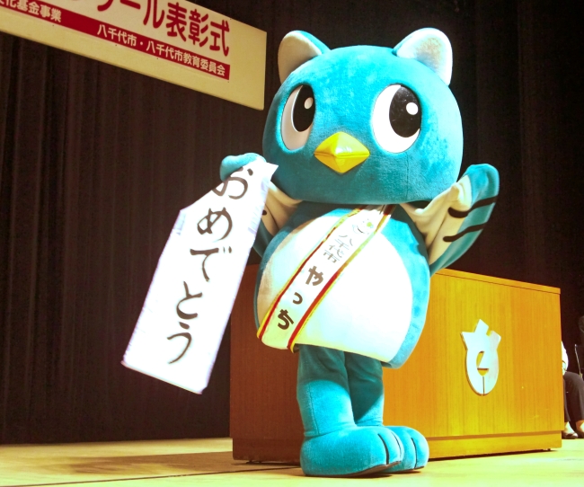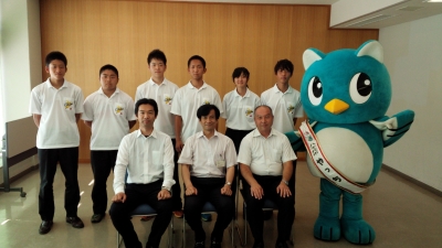 平成27年度全国高等学校総合体育大会に出場する高校生のみなさんが、大会前に来てくれました! 八千代高校の選手と顧問の皆さん |