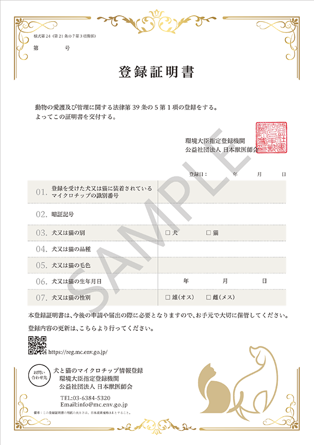 - 装着後,動物病院から発行される「マイクロチップ装着証明書 [PDFファイル/779KB]」を発行を受ける