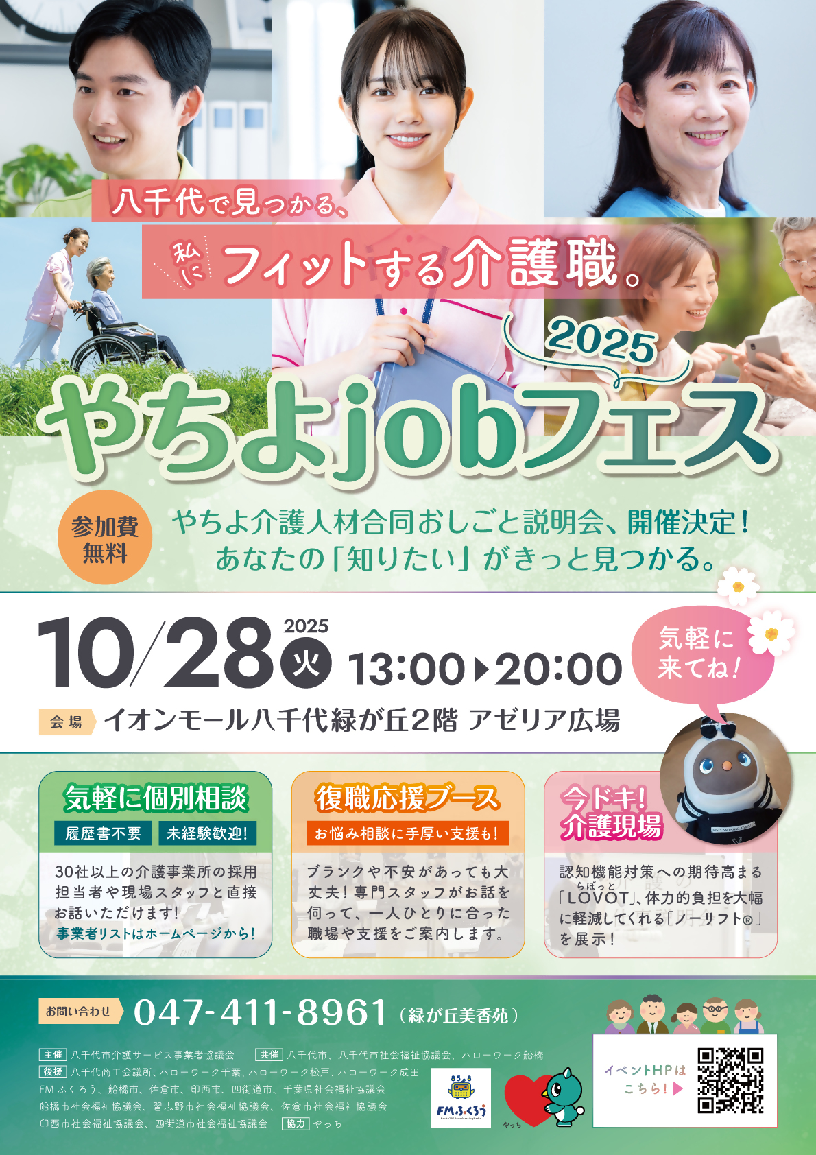 八千代市介護サービス事業者協議会主催の「やちよ介護人材合同おしごと説明会」を開催します。