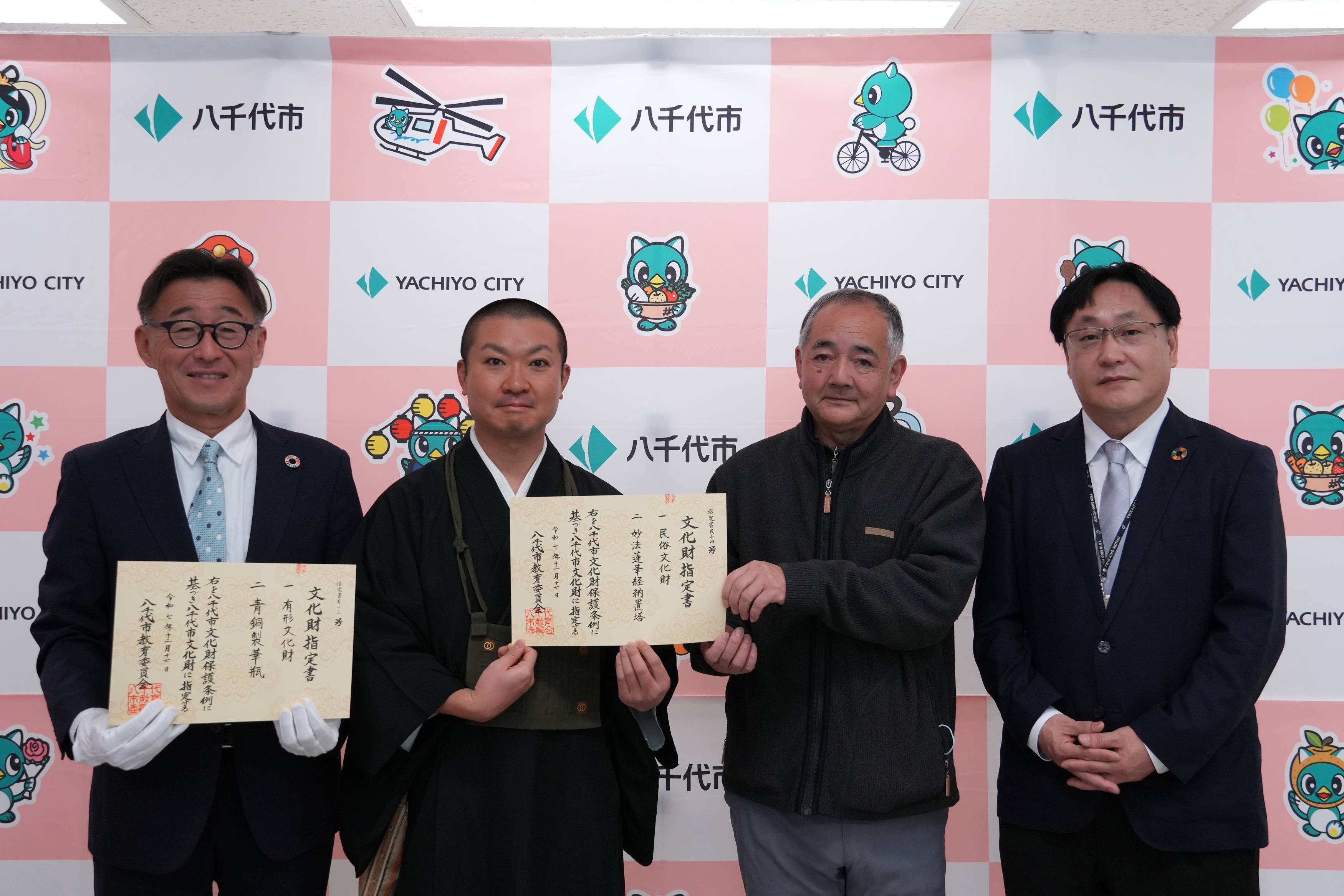桑納にある威光院の妙法蓮華経納置塔と村上にある正覚院館跡で出土した青銅製華瓶が令和7年12月17日に八千代市では2年ぶりとなる市文化財の指定を受け,教育委員会庁舎において文化財指定書が嶺岸教育長から関係者に手渡されました。これで市指定文化財は30件となりました。